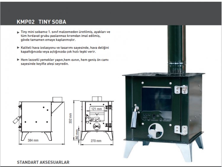 - Tiny mini sobamız 1. sınıf malzemeden üretilmiş, ayakları ve tüm hırdavat grubu paslanmaz kromdan imal edilmiş, gövde tamamen emaye kaplanmıştır.